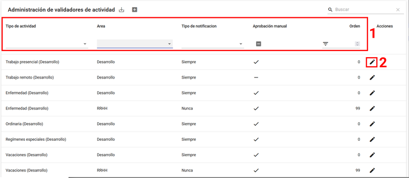 El menú de validadores de actividad muestra los validadores de los tipos de actividades de la empresa. Tiene la opción de filtrar la tabla por un resultado de búsqueda y por los filtros marcados en [1]. Además, exportar las área por medio del botón presente en el título.