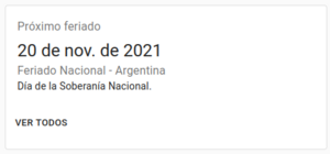 Dentro de la tarjeta se puede ver la Fecha, la categoría de feriado, la descripción y un vínculo a la sección de feriados (botón "Ver todos").